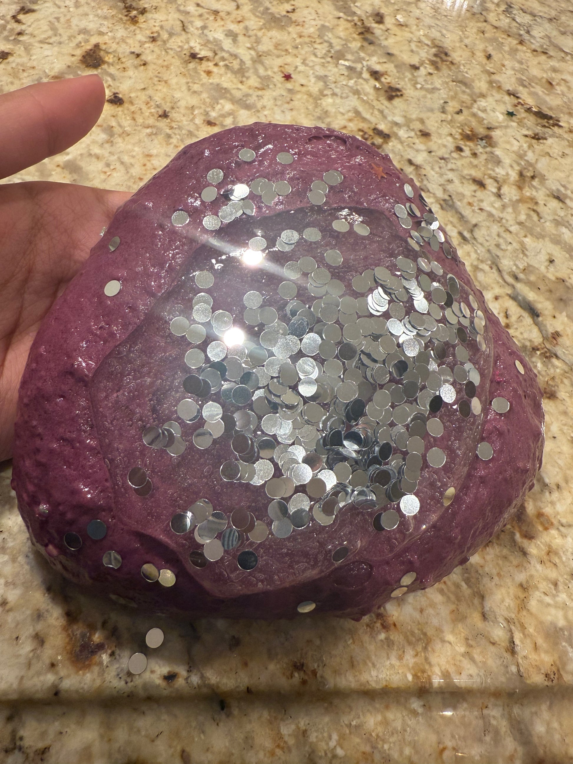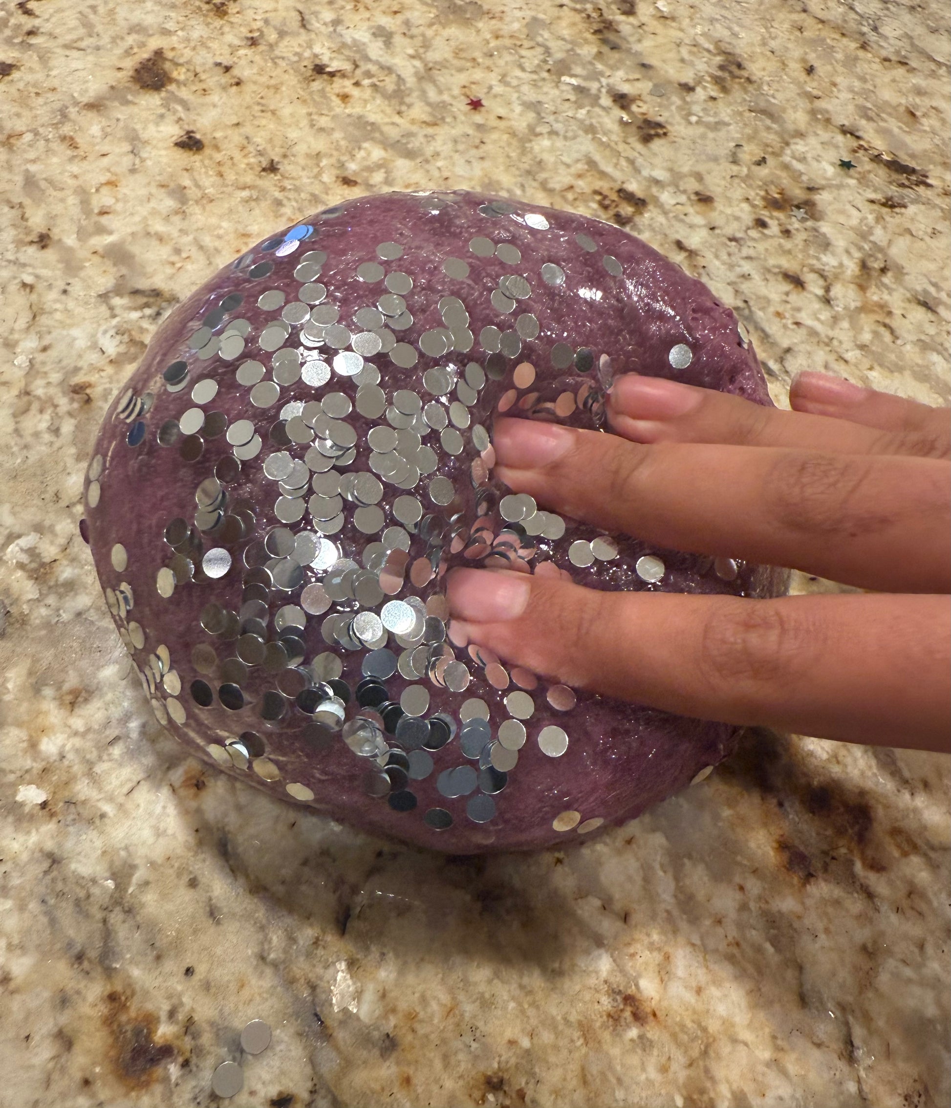 This is a purple white glue based clay slime topped with a layer of clear slime and then beautiful silver sequins. In simple terms, it looks beautiful and mixes together to a soft and stretchy buttery slime. It smells like lavender and fresh linen. As with all of our slimes, the sequins come unmixed so you can add them in and experience mixing them hands-on (which is my personal favorite part!!).