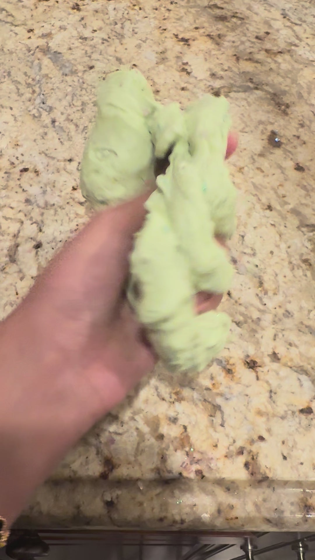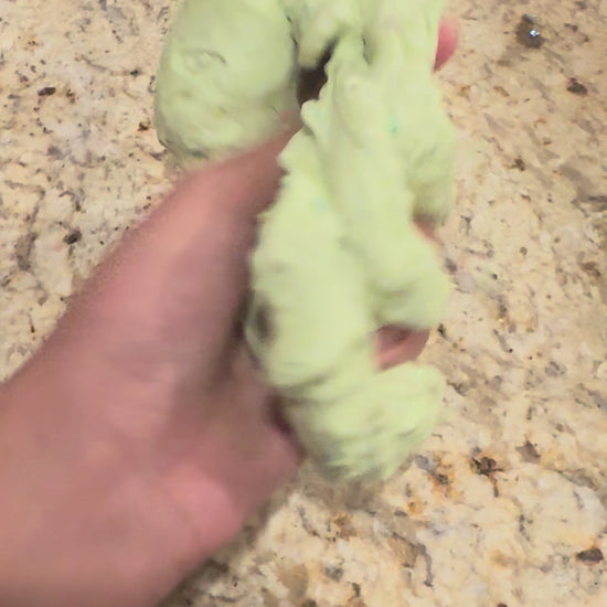This slime reminds me of a 1970's disco because of its eccentric color combination. It is a soft butter slime which comes with sparkly bingsu beads that had a crunchy texture. Once mixed together, the slime makes great ASMR sounds and is fun to stretch, fold, spread, and inflate. It smells just like key-lime pie.